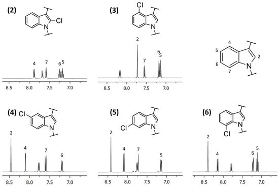 All five isomers were characterized via 1H and 13C NMR (incl. 2D) spectroscopy. The respective spectra can be found in the Supplementary Materials. Figure 2 shows excerpts of the most discriminative areas of 8.5 to 7 ppm of the 1H-NMR spectrum for all isomers (reported relative to tetramethylsilane) as the spectrum in the range of 7 to 0 ppm was similar for all isomers. The absence or presence of singlets in the aromatic region of the spectra are the most discriminating indicators for the substitution of hydrogen with chlorine on different positions of the indole.