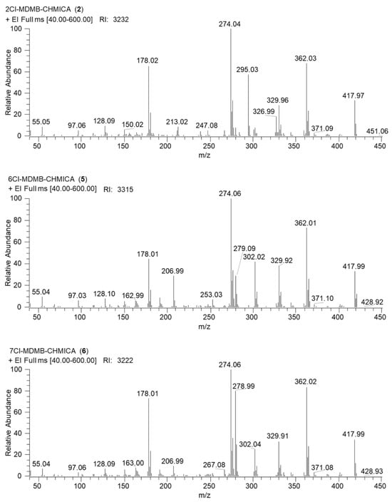 GC-EI-MS spectra of 2-Cl-, 6-Cl-, and 7-Cl-MDMB-CHMICA.