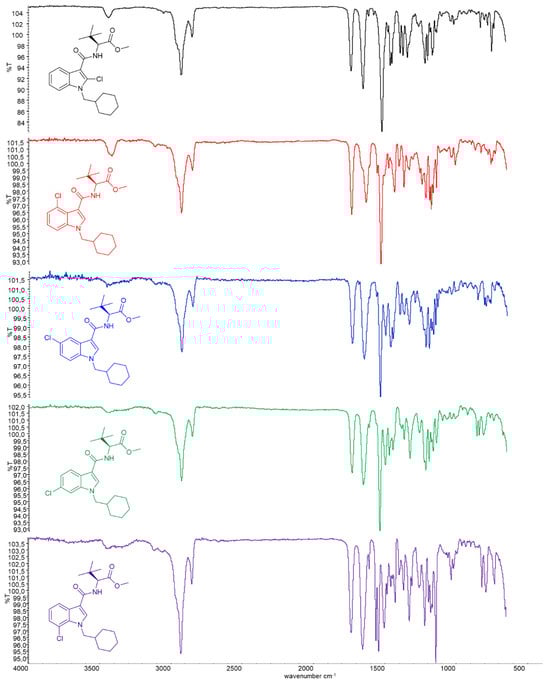The implementation of GC condensed phase IR analysis (GC-sIR) allows for the collection of spectral data directly from chromatographic peaks whereby the analyte is deposited cryogenically onto an IR-transparent zinc selenide disc. This technique is especially important for the analysis of mixtures, which normally occur in designer drugs containing cannabimimetic compounds. The advantage of employing this method is that IR spectra are recorded in a solid state comparable to freebase spectra with sharp distinct bands recorded under traditional conditions, for example, by using a Fourier transform attenuated total reflection (ATR) approach. Further discrimination could be achieved for all chlorinated indole derivatives by comparing the IR spectra in Figure 4. Whereas the infrared spectra of 2, 3, and 6 are completely different in the fingerprint region, the spectra of 4 and 5 are very similar. The spectra of 4 and 5 could however be distinguished by small but discrete differences in the absorption bands in the fingerprint region of the IR spectra. Therefore, IR is able to differentiate all synthesized chloro-analogues of MDMB-CHMICA. The individual full spectra and fingerprint zooms of all isomers can be taken from the Supplementary Materials.