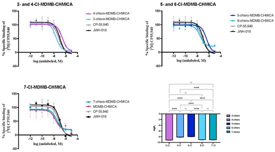 On the basis of our results, the substitutions can be ranked in the following order regarding the hCB1 receptor binding affinity: 2-chloro > 7- and 6-chloro > 4-chloro > 5-chloro. The results of the chlorinated compounds 1–5 proved to be significantly different with respect to the logKi, as shown by the extra sum-of-squares F-test and ANOVA with post hoc Bonferroni analysis, both with (p = 0.0001). Particularly, 4- and 5-chloro-MDMB-CHMICA significantly differed from 2-, 6-, and 7-chloro-MDMB-CHMICA, as shown in Figure 6.