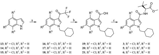 Two general procedures were used to synthesize compounds 2–6. Chlorinated indole-3-carbaldehydes were N-alkylated, oxidized to the carboxylic acids, and then subjected to an amide coupling with tert-leucine methyl ester (TLME). Alternatively, chloroindoles were N-alkylated, trifluoroacetylated in 3-position, subjected to a haloform reaction, and the resulting carboxylic acids were coupled as described above. The precursor 2-chloroindole-3-carbaldehyde 7 was synthesized from oxindole in a separate synthesis as shown in Scheme 1.
