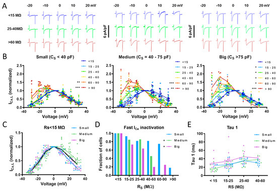 Impact of cell size and access resistance on the shape of the current–voltage relationship. (A) Representative ICa recordings at voltages between −20 and +20 mV at access resistances (Rs) < 15 mΩ, between 25 and 40 MΩ and >60 MΩ. Recordings were classified according to the cell capacitance (CS) as small (left), medium-sized (center), or big myocytes (right). (B) Current–voltage relationship determined in 51 cells from 15 patients with different Rs given on the right. Values were normalized to the current density at 0 mV. (C) I–V relationship determined with Rs < 15 mΩ in small, medium-sized, and big myocytes. Statistical significance in panels (B,C) was determined using a two-way ANOVA followed by a Tukey’s HSD post hoc test. (D) Fraction of myocytes with fast ICa inactivation (tau-1) at different Rs given below bars. Statistical significance in panel (D) was determined using a multivariate logistic regression model. (E) Tau-1 measured at different Rs (given below bars) in small, medium-sized, and big myocytes. Statistical significance in panel E was determined using two-way ANOVA followed by Tukey’s HSD post hoc test. Groups significantly different from the Rs < 15 MΩ group are indicated with *: p < 0.05, **: p < 0.01, ***: p < 0.001.