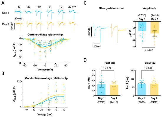 To determine if the overnight storage of myocytes affected the ICa properties, we first compared the cell capacitance on the day of isolation (Day 1) and the following day (Day 2), and we found no statistically significant differences between the two groups (60.3 ± 8.9 pF for Day 1 vs. 64.2 ± 9.0 pF for Day 2, n = 15, p = 0.64). We also found that success rates were similar on Day 1 and Day 2. Thus, analysis of myocytes with an acceptable access resistance showed that the experimental protocol could be completed in 25 of 29 (86%) myocytes on Day 1, and pharmacological treatment followed by repetition of the experimental protocol could successfully be performed in 22 of the 25 myocytes (88%). On Day 2, the experimental protocol was successfully executed in 22 of 24 myocytes (92%), and pharmacological treatment plus repetition of the protocol was achieved in 19 of the 22 myocytes (86%). Subsequently, we compared the I–V relationship in the two groups. Figure 2A shows representative current recordings in the top panel, and individual data points for the ICa densities recorded at the different membrane potentials are shown below for Day 1 and Day 2, demonstrating that there were no significant differences between the two groups. This was also true for the conductance–voltage relationship (Figure 2B). Additionally, we compared the impact of overnight storage on the steady-state ICa density. As shown in Figure 2C, there were no significant differences between the two groups of myocytes paced at 0.5 Hz. Similarly, Figure 2D shows that neither the fast (tau-1) nor the slow time constant (tau-2) for ICa inactivation was different between the two groups.