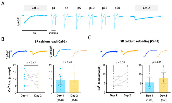 Impact of overnight storage on SR calcium loading. (A) Experimental protocol used to estimate SR calcium load by exposing myocytes transiently to 10 mM caffeine (Caf-1). Subsequently, 20 stimulation pulses (p1–p20) were used to reload the SR, and a second caffeine application (Caf-2) was used to determine the amount of calcium re-accumulated in the SR. Representative current traces elicited by Caf-1 (B) and Caf-2 (C) with their respective time integrals are shown on the top and mean values of the time integrals are shown below, illustrating changes on the left (paired values are connected with bars) and confidence intervals on the right. Number of cells/patients is given below bars. Statistical significance in panels (B,C) was determined using a paired t-test to compare data from the same patients recorded on Day 1 and Day 2.