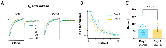 To determine the time course of calcium reuptake by the SR after the first exposure to caffeine, we measured the time constant for fast ICa inactivation (tau-1), which is inversely proportional to SR calcium loading. Figure 4A shows superimposed ICa recordings elicited by the 20 stimulation pulses used to reload the SR. Notice that the first ICa trace (when the SR is empty) has a slower inactivation than trace #20 (when the SR has been reloaded). Figure 4B compares the pulse-dependent change in tau-1 in representative myocytes from Day 1 and Day 2. Data in Figure 4B were fitted with an exponentially decaying function in order to estimate the number of stimulation pulses necessary to achieve half-maximal recovery of tau-1. Tau-1 values are shown in Figure 4C. On average, six pulses were required to achieve half-maximal recovery of tau-1, which was 24.4 ± 2.2 ms for Day 1 and 24.7 ± 2.2 ms for Day 2 (p = 0.9). Again, there were no significant differences between Day 1 and Day 2.