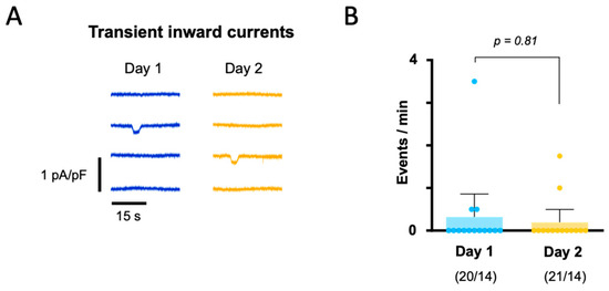 Impact of overnight storage on the incidence of transient inward currents. (A) Representative current traces recorded in myocytes from the same patient isolated on Day 1 (blue) and Day 2 (yellow). (B) Mean ITI frequency recorded on Day 1 and Day 2. Error bars represent 95% confidence intervals. The p-value given above bars was determined using the Wilcoxon signed-rank test to compare data from the same patients recorded on Day 1 and Day 2.