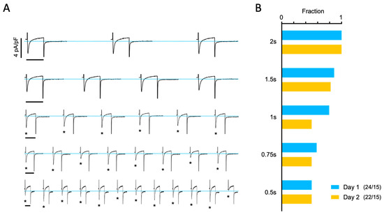 Impact of overnight storage on the beat-to-beat response. (A) Representative current traces recorded over a 6 s period in a myocyte paced at increasingly shorter stimulation intervals (given on the right). Horizontal scale bars indicate 200 ms for the traces. The peak ICa is indicated with asterisks at stimulation intervals of 1 s or shorter. (B) Fraction of 46 myocytes from 15 patients showing a uniform ICa amplitude for each stimulation frequency, recorded on Day 1 (blue bars) or Day 2 (yellow bars).