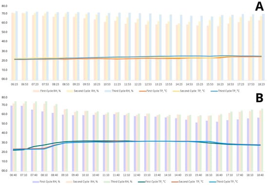 Temperature (TP) and Relative Humidity (RH) per week. First cycle (26, 27, 28, 29 wks), Second cycle (30, 31, 32, 33 wks), and Third cycle (34, 35, 36, 37 wks). (A)—Termoneutral; (B)—Heat stress.