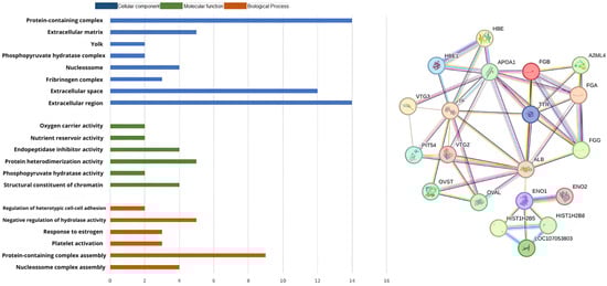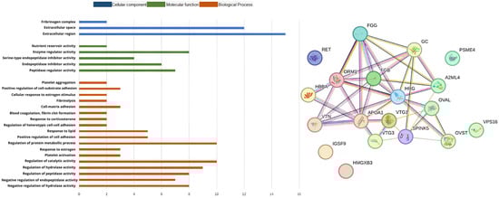 The gene ontology analysis was used to classify the protein sequences into biological processes (BP), molecular functions (MF), and cellular components (CC). GO functional analysis showed that the proteins identified when the diet was CONST in the BP group were primarily involved in the regulation of catalytic activity (10), protein metabolic processes (10), hydrolase activity (9), negative regulation of hydrolase activity (8), peptidase activity (8), and endopeptidase activity (7). In the MF group, the genes were primarily involved in enzyme (8), peptidase (7), and endopeptidase inhibitor activities (6). In the CC group, they were primarily located in the extracellular (15) and space (12) regions, as shown in Figure 2. In the GO functional analysis of the proteins identified in the POST group, those in the BP were primarily involved in protein-containing complex assembly (9), negative regulation of hydrolase activity (5), and nucleosome assembly (4). In the MF group, these genes were primarily involved in protein heterodimerization (5), structural constituents of chromatin (4), and endopeptidase inhibitor activity (4). In the CC, were primarily involved in the extracellular region (14), protein-containing complexes (14), and extracellular space (12), as shown in Figure 3.