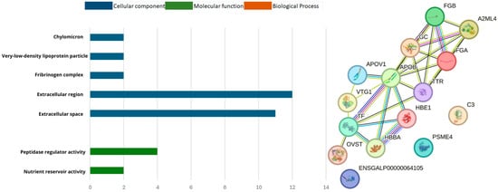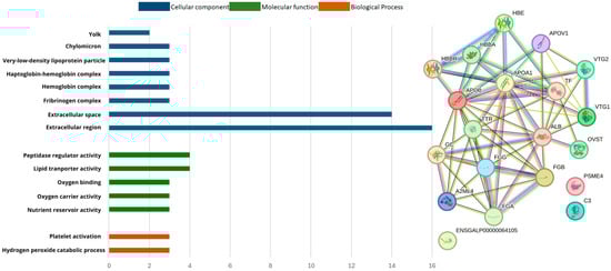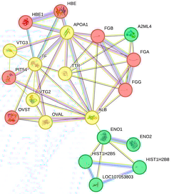 A protein–protein interaction network, differentially expressed in the plasma blood of laying hens supplemented with POST, was constructed using the String program and the Gallus gallus genome (Figure 6). The interactions revealed the proteins regulated by the inclusion of PO in the diet and how they collectively contributed to a shared function. The network was clustered into three groups: proteins involved in anti-inflammatory activity (red cluster), substance transport (yellow cluster), and immune system proteins (green cluster).