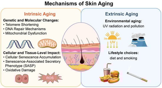 Intrinsic aging is a natural, biologically programmed process driven by genetic and molecular changes within the skin over time [29,30]. Key genetic factors, such as telomere length and the function of DNA repair mechanisms, play critical roles [31]. Telomeres, the protective caps at the ends of chromosomes, shorten with each cell division, eventually leading to cellular senescence when they become critically short [32,33]. Variants in genes involved in DNA repair, like Werner syndrome ATP-dependent helicase (WRN), and superoxide dismutase 2 (SOD2) [34], can influence the rate of aging by affecting the cellular response to oxidative stress and DNA damage [35]. A hallmark of intrinsic aging is the accumulation of senescent cells that have permanently exited the cell cycle. Although senescence serves as a protective mechanism against cancer, the persistence of these cells contributes to tissue dysfunction. Senescent cells secrete pro-inflammatory cytokines, growth factors, and proteases, collectively known as the senescence-associated secretory phenotype (SASP), which disrupts normal tissue function, leading to the breakdown of collagen, increased elastin degradation, and impaired skin repair [36]. Mitochondrial function also declines in the aging skin cells, resulting in reduced energy production and increased production of reactive oxygen species (ROS) [37,38], which cause oxidative damage to cellular components, including DNA, proteins, and lipids. Mitochondrial DNA, being particularly susceptible to damage, accumulates mutations over time, further impairing mitochondrial efficiency [39]. This decline in mitochondrial function contributes to the loss of cellular function and the onset of skin aging, which is manifested by thinning and sagging skin [40].
