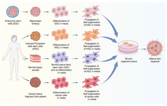 The generation of skin organoids is increasingly reliant on advanced 3D culture techniques, which provide a more physiologically relevant environment compared to traditional 2D cultures. In a 3D setting, cells can interact in a manner that mimics their natural organization within tissues [52,53]. These interactions are essential for the development of complex structures like hair follicles, sweat glands, and the layered architecture of the skin. Biomaterials and scaffolding are critical to the structural development of skin organoids. Materials like Matrigel and collagen scaffolds provide the necessary framework for cells to organize into three-dimensional structures, thereby facilitating the formation of complex skin layers and appendages. These scaffolds not only maintain the shape of developing organoids but also provide essential biochemical cues that guide cell differentiation and tissue formation. For instance, co-culturing sebocytes with keratinocytes on a scaffold offers a suitable model for studying drug responses in a controlled environment [54]. One of the defining features of skin organoids is their ability to replicate the multicellularity of natural skin. Skin organoids consist of various cell types, including keratinocytes, melanocytes, and fibroblasts, which are essential for forming the distinct layers and structures of the skin. This multicellularity ensures that skin organoids exhibit structural features closely resembling native skin, such as the stratified epidermis, dermal–epidermal junctions, and subcutaneous fat layers, which are essential for studying skin diseases and testing novel therapies. Beyond structural mimicry, skin organoids also demonstrate the critical functional characteristics of native skin, including barrier function and the development of skin appendages like hair follicles and sweat glands. These organoids have been shown to replicate essential features of human skin, including the ability to undergo regular epidermal turnover and maintain a protective barrier against environmental damage. The inclusion of functional appendages in organoid models enhances their utility for studying skin physiology, pathology, and the efficacy of potential treatments [55]. The development of skin organoids from different sources of stem cells is graphically depicted in Figure 3.