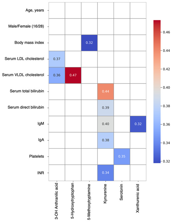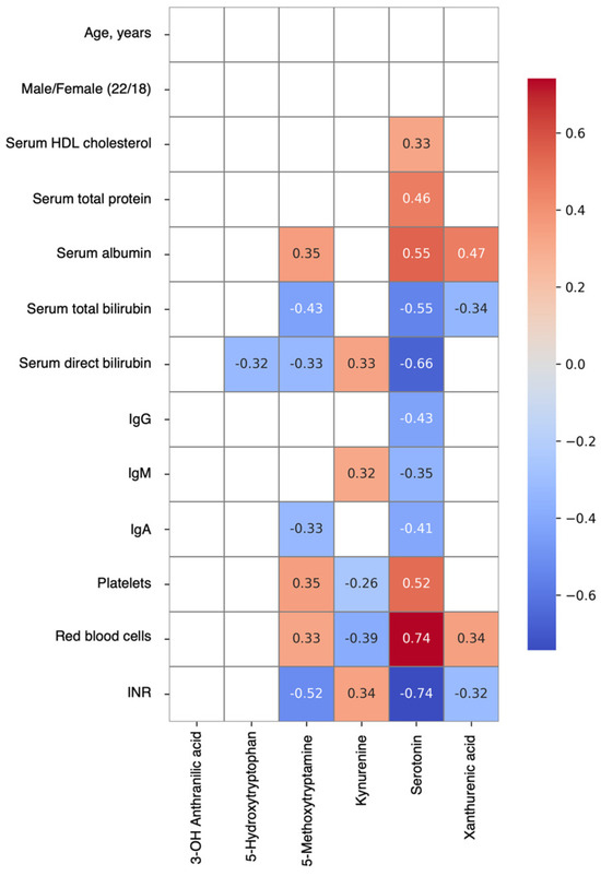 The levels of serotonin (p = 0.048) and 5-methoxytryptamine (p = 0.024) in patients with liver cirrhosis of various etiologies positively correlate with platelet levels, which are significantly lower than in the control group (p < 0.001) and decrease as the disease progresses to cirrhosis (Table 1, Figure 2 and Figure 3). In the analysis of the correlation between serotonin levels in patients with ALD and the parameters of the complete blood count (CBC) and coagulation profile, a significant negative correlation was noted between the levels of this metabolite (ρ = −0.743; p <0.001) and 5-methoxytryptamine (ρ = −0.520; p <0.001) and the INR indicator. Kynurenine levels positively correlate with the INR indicator in both patients with ALD (ρ = 0.340, p = 0.032) and those with MAFLD (ρ = 0.338; p = 0.025) (Figure 2 and Figure 3). In addition, a positive correlation was noted between serotonin levels and total protein (ρ = 0.463, p = 0.003) and albumin (ρ = 0.548, p < 0.001) levels, as well as HDL cholesterol levels (ρ = 0.329, p = 0.038), in the ALD patient group. Negative correlations were observed with total and direct bilirubin levels, as well as immunoglobulin levels (IgA (ρ = −0.41, p = 0.008), IgM (ρ = −0.352, p = 0.026), and IgG (ρ = −0.427, p = 0.006)). These and other statistically significant results of correlations between metabolite levels and CBC and biochemical analysis parameters are presented in Tables S2 and S3.
