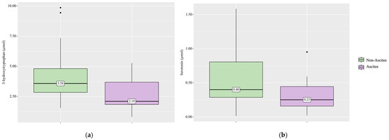 A detailed analysis of the liver cirrhosis group showed that the development of ascites was associated with a decrease in serotonin levels (p = 0.031) and its precursor 5-hydroxytryptophan (p = 0.013) (Figure 4).