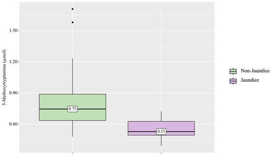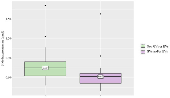 It was found that the decrease in the serotonin pathway metabolite, 5-methoxytryptamine, was associated with the development of jaundice (p < 0.001) in patients with cirrhosis, as well as with the presence of portal hypertension based on esophagogastroduodenoscopy (EGD) data (p = 0.018) (endoscopic appearance of gastric varices (GVs) and/or esophageal varices (EVs)) (Figure 5 and Figure 6).