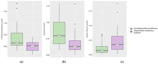 The kynurenine pathway metabolite, xanthurenic acid, is associated with the development of hepatic encephalopathy (p = 0.044). An increase in the level of the metabolite of the indole pathway (indole–3-butyric acid (p = 0.034)) and a decrease in serotonin (p = 0.008) and 5-methoxytryptamine (p = 0.019) were found to be associated with the development of hepatocellular insufficiency (hypoalbuminemia, hypocoagulation) (Figure 7).
