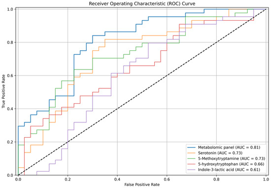 Additionally, receiver operating characteristic (ROC) analysis was performed using the logistic regression classification model assessing the diagnostic power for certain metabolites and the combined tryptophan metabolic panel. The area under curves (AUCs) for “the best” diagnostic metabolites (serotonine, 5-methoxytryptamine, 5-hydroxytryptophan, indole-3-lactic acid) and metabolic panel are presented in Figure 8. The metabolomic panel consisting of all 17 tryptophan metabolites is more stable for determining the etiology of liver disease (MAFLD vs. ALD). The AUC for the metabolic panel is 0.81.