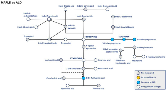Changes in the tryptophan metabolites levels in patients with MAFLD compared to ALD.