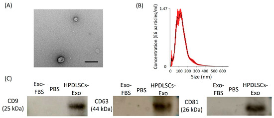 Isolation of human periodontal ligament stem-cell-derived exosomes (HPDLSCs-Exo). (A) An image of HPDLSCs-Exo was obtained by transmission electron microscopy. Scale bar = 200 nm. (B) Particle size distribution of HPDLSCs-Exo was analyzed by nano tracking analysis. Measurement of the particle size was performed five times and the average values were plotted. The mean value of the particles was 133 ± 6.4 nm and the mode (the most commonly occurring value) was 94 ± 21 nm. (C) Western blotting analysis showed the expression of CD9, CD63, and CD81 in HPDLSCs-Exo. Exosome-depleted FBS (Exo-FBS) and PBS were used as negative controls.