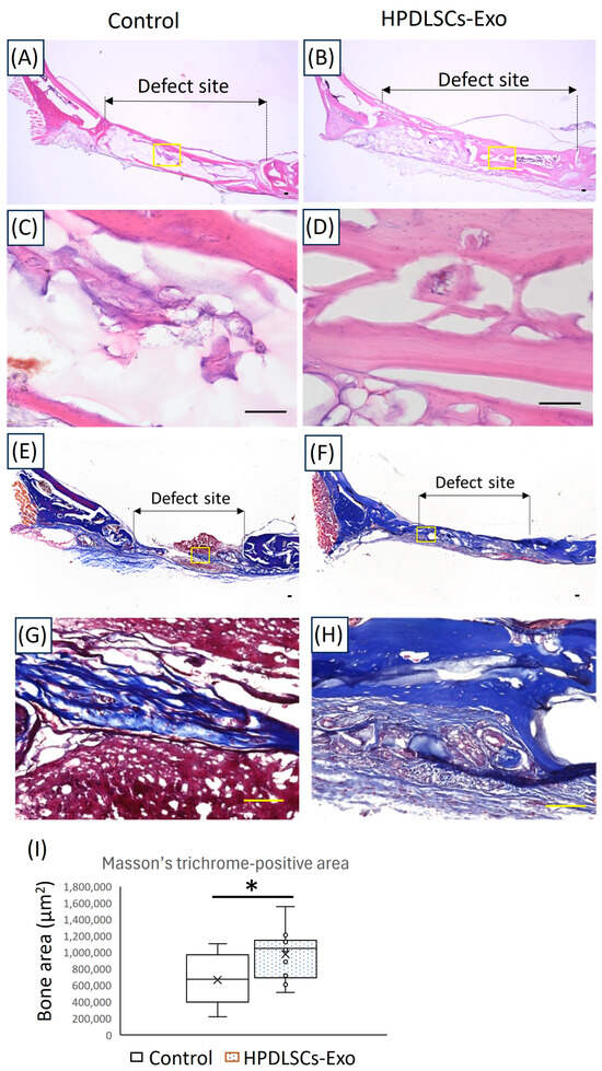 Histological analyses of the newly formed bone areas at the defect sites in rat calvarial bone. (A–D) Images of calvarial bone defect sites made in 12-week-old rats after 6 weeks of treatment with hydrogel made with PBS (control) or 60 µg/mL of HPDLSCs-Exo (HPDLSCs-Exo) were analyzed after HE staining. Panels (C,D) are magnified images of the yellow boxes in panels (A,B). Scale bars = 100 μm. (E–H) Images of calvarial bone defect sites from rats after 6 weeks of treatment with control or HPDLSCs-Exo were analyzed after Masson’s trichrome staining. Panels (G,H) are magnified images of the yellow boxes in panels (E,F). Scale bars = 100 μm. (I) The areas of newly formed bone at the defect sites in Masson’s trichrome staining (blue) were quantified. n = 5, * p < 0.05.