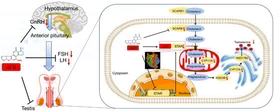 In short, the evidence indicates that AFB1 exposure can disrupt the HPG axis and inhibit the production of FSH and LH, then reduce the synthesis of testosterone, finally causing reproductive dysfunction and infertility in males. Moreover, AFB1 exposure-mediated inhibition of testosterone synthesis in Leydig cells may involve the inhibition of the SCARB1/STAR/CYP11A1 pathway. This may largely be due to the fact that AFB1 exposure could inhibit the transcriptional expression of STAR or directly interact with STAR, thus inhibiting the transportation of cholesterol. Figure 1 summarizes the working model of AFB1 exposure on the destruction of the hypothalamic–pituitary–testis axis and the production of hormones in Leydig cells. To date, further research into the exact molecular mechanisms of AFB1 exposure on each part of the HPG axis and the production of testosterone is urgently lacking.