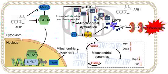 Mitochondrial biosynthesis and dynamics also play an important role in regulating the functionality of mitochondria [84]. Mitochondrial biogenesis ensures the renewal and adaptation of the mitochondrial population when there is damage or an increased need for energy; if biogenesis is impaired, mitochondrial dysfunction can be worsened [85]. Huang et al. discovered that when AFB1 was orally administered at doses of 0.375, 0.75, or 1.5 mg AFB1/kg of body weight per day for 30 days, the expression of nuclear respiratory factor 1 (Nrf1), peroxisome proliferator-activated receptor gamma coactivator-1α (PGC-1α), and transcription factor mitochondrial transcription factor A (TFAM) proteins, were significantly downregulated [59,61]. PGC-1α is regarded as the main regulator of mitochondrial biogenesis and function; both in vivo and in vitro, its overexpression can enhance mitochondrial biogenesis and boost mitochondrial respiratory chain activities [86]. PGC-1α could transcriptionally activate the expression of Nrf2 and Nrf1 [86]. Furthermore, Nrf1 regulates the transcription of TFAM, then binds to mitochondrial DNA (mtDNA) and starts the expression of mtDNA gene products encoding subunits of ETC enzyme complexes and regulates the function of the mitochondrial respiratory chain [87]. Available evidence indicates that the downregulation of the PGC-1α/Nrf1/TFAM pathway by AFB1 resulted in a reduction in mitochondrial biosynthesis. Nrf1 cooperates with DNA methylation and directly regulates germ cell-specific genes, such as ankyrin repeat, SAM, and basic leucine zipper domain-containing 1 (ASZ1), and plays a critical role in the process of spermatogenesis [88]. This indicates that the inhibition of the PGC-1α/Nrf1 pathway may also contribute to the dysfunction of spermatogenesis. In addition, previous studies have also found that AFB1 exposure could significantly downregulate the expression of the p-AMPK protein in primary Leydig cells and the testis tissues in adult rats exposed to AFB1 [46]. AMPK is a key regulator of PGC-1α signaling and the activation of AMPK positively regulates the expression of PGC-1α, which promotes mitochondrial biogenesis [89]. It has been demonstrated that the inhibition of AMPK/PGC-1α contributes to drug or high-fat diet (HFD)-induced testicular injury [89]. This pathway was also documented to participate in AFB1-induced liver toxicity [51]. Therefore, mitochondrial biosynthesis in testicular tissues as a result of AFB1 exposure may also involve the inhibition of the AMPK/PGC-1α pathway. But precious mechanisms still need to be addressed. Moreover, in the testicular tissues of animals treated with AFB1, the expression of several biomarkers of mitochondrial dynamics, such as fission 1 (Fis1), optic atrophy 1 (Opa1), dynamin-related protein 1 (Drp1), and mitofusins 1 (Mfn1), were significantly decreased [90]. Mitochondrial dynamics consist of the opposing processes of fusion and fission, and under normal physiological conditions, they are generally balanced. When this balance is disrupted, the excessive production of ROS will occur, which leads to lipid peroxidation, a decrease in MMP, and reduced respiratory function and ATP production, finally culminating in mitochondrial dysfunction [90]. Collectively, these results indicate that exposure to AFB1 may damage mitochondrial dynamics, thus promoting testicular mitochondrial dysfunction.