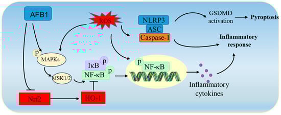 In summary, current research data indicate that AFB1 exposure could induce inflammatory responses in testicular tissue via the activation of MAPKs, NF-κB, and NLRP3 pathways (Figure 4). The upregulation of ROS and the inhibition of Nrf2 due to AFB1 exposure may also contribute to the activation of inflammatory responses via the regulation of NF-κB. But the previously mentioned molecular mechanisms still need to be investigated further. Additionally, NLRP3-mediated pyroptosis, via the activation of gasdermin D (GSDMD), has been demonstrated to be involved in AFB1 exposure-induced hepato- and neurotoxicity [7,78]. Recently, a transcriptomics study revealed that multiple innate immune regulatory pathways are involved in regulating AFB1 exposure-induced reproductive toxicity, such as the NOD-like receptor signaling pathway, cytosolic DNA-sensing pathway, and RIG-I-like receptor signaling pathway [63]. These pathways have been implicated in AFB1 exposure-induced hepato- and nephrotoxicity [6,7]. Further exploration is needed to determine how these inflammatory signaling pathways, regulating reproductive toxicity, are impacted by AFB1 exposure.