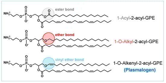 - Kimura, T.; Kimura, A.K.; Epand, R.M. Systematic crosstalk in plasmalogen and diacyl lipid biosynthesis for their differential yet concerted molecular functions in the cell. Prog. Lipid Res. 2023, 91, 101234. [Google Scholar] [CrossRef] [PubMed]