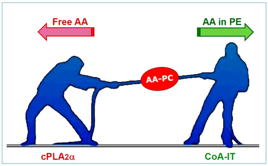 Dual role of AA-containing PC (AA-PC) in lipid signaling. The levels of AA within the PC class of phospholipids are influenced by two opposing reactions, resembling a tug-of-war. On the one hand, cytosolic phospholipase A2α (cPLA2α) acts on AA-PC to release free AA. On the other hand, coenzyme-A-independent transacylase (CoA-IT) transfers AA directly from PC to PE. By channeling AA from PC to PE, CoA-IT may effectively reduce the availability of substrate for cPLA2α, thereby limiting eicosanoid formation in activated macrophages.