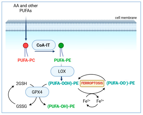 AA: arachidonic acid (cis-5,8,11,14-eicosatetraenoic acid, 20:4n–6); AdA, adrenic acid (cis-7,10,13,16-docosatetraenoic acid, 22:4n–6); DHA, docosahexaenoic acid (cis-4,7,10,13,16,19-docosahexaenoic acid, 22:6n–3); CoA-IT, coenzyme-A-independent transacylase; GPX4, glutathione peroxidase 4; PC, choline-containing glycerophospholipids; PE, ethanolamine-containing glycerophospholipids; PI, phosphatidylinositol; PUFA, polyunsaturated fatty acid.