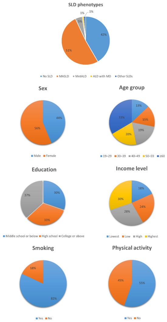 Table 2 indicates the characteristics of the study sample according to the SLD categories. The study sample consisted of 8813 men (43.8%) and 11,328 women (56.2%) with a mean age of 50.8 years. The prevalence rates of no SLD, MASLD, MetALD, ALD with MD, and other SLDs were 41.6%, 51.4%, 4.7%, 1.0%, and 1.3%, respectively. Compared to those without SLD, the proportions of men, older individuals, and individuals with lower educational and income levels were higher among those with MASLD. Additionally, the median values of AST were 19.0, 21.0, 24.0, 24.0, and 19.0 for no SLD, MASLD, MetALD, ALD with MD, and other SLDs, respectively. Similarly, the median values of ALT were 13.0, 21.0, 25.0, 25.0, and 21.0 for no SLD, MASLD, MetALD, ALD with MD, and other SLDs, respectively. Figure 1 also shows the distribution of characteristics among the study sample.