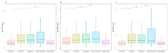 Distribution of hs-CRP (high-sensitivity C-reactive protein) values according to SLD subtypes (SLD, steatotic liver disease). (A) Median (Q1, Q3) values of hs-CRP in the overall sample, (B) median (Q1, Q3) values of hs-CRP in the male sample, and (C) median (Q1, Q3) values of hs-CRP in the female sample. Wilcoxon rank sum test was employed (* p < 0.05, *** p < 0.001). Abbreviation: MASLD, metabolic dysfunction-associated steatotic liver disease; MetALD, metabolic alcohol-associated liver disease; ALD with MD, alcoholic liver disease with metabolic dysfunction; NS: non-significant differences.