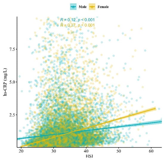 Figure 3 presents a scatter plot of HSI and hs-CRP values among the samples. The Pearson’s coefficient between HSI and hs-CRP was 0.12 (p < 0.001) among men and 0.27 (p < 0.001) among women.
