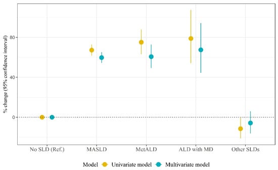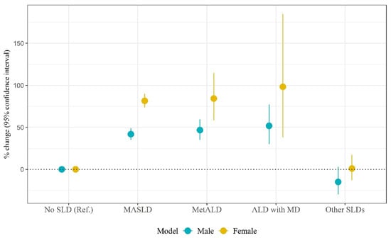 Table 3 presents the association between the SLD categories and hs-CRP levels using log-linear regression models. Compared to levels in non-SLD, MASLD, MetALD, and ALD with MD were associated with 59.7% (95% CI: 54.5%, 65.1%; p < 0.001), 60.6% (95% CI: 49.3%, 72.8%; p < 0.001), and 67.5% (95% CI: 44.4%, 94.2%; p < 0.001) increases in hs-CRP values, respectively (multivariate model). Table S1 presents the results of the models with interaction terms. There were significant interactions between MASLD and females (p < 0.001) and between MetALD and females (p = 0.016) for hs-CRP values. The plot depicting the association between SLD subtypes and hs-CRP among the overall sample is depicted in Figure 4.