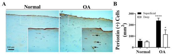- Tajika, Y.; Moue, T.; Ishikawa, S.; Asano, K.; Okumo, T.; Takagi, H.; Hisamitsu, T. Influence of Periostin on Synoviocytes in Knee Osteoarthritis. In Vivo 2017, 31, 69–77. [Google Scholar] [CrossRef] [PubMed]