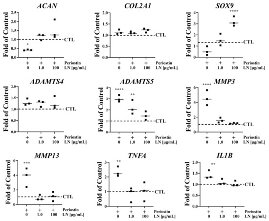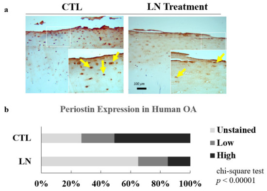 - Chijimatsu, R.; Kunugiza, Y.; Taniyama, Y.; Nakamura, N.; Tomita, T.; Yoshikawa, H. Expression and pathological effects of periostin in human osteoarthritis cartilage. BMC Musculoskelet. Disord. 2015, 16, 215. [Google Scholar] [CrossRef]