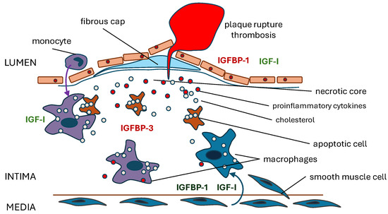 Most cardiovascular diseases are caused by atherosclerosis within the walls of large arteries. It is likely that this process is initiated by endothelial dysfunction, which mediates arterial wall shearing stresses and proinflammatory cell recruitment and invasion [116]. Adipose tissue also contributes to the proinflammatory environment, with dysregulated adipokine production in obesity playing a crucial role [117]. In addition to monocytes from the circulation, smooth muscle cells (VSMCs) are recruited from the arterial wall, and within the intima, both cell types make a phenotypic switch to express macrophage markers that can bind to modified low-density lipoproteins and that have highly proinflammatory characteristics [118]. In more advanced disease, vulnerable plaques, which are lesions consisting of a lipid core with active inflammation and a thin fibrous cap, are formed (illustrated schematically in Figure 2). Evidence suggests that overall, IGF-I has beneficial effects, reducing plaque burden and increasing plaque stability by a variety of mechanisms [3,119]. IGF-I reduces monocyte/macrophage recruitment, production of proinflammatory cytokines, conversion into lipid-laden foam cells and contribution to matrix degradation. IGF-I promotes SMC migration and proliferation and VSMC-dependent matrix deposition. These effects on VSMCs are of particular importance to plaque stability.