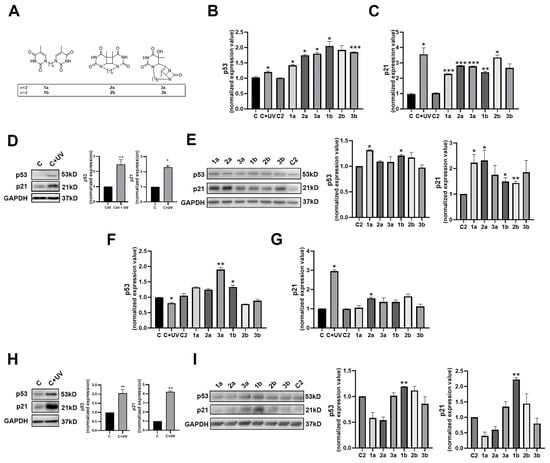 Transcript and protein expression levels of p53 and p21waf1 were assessed by RT-qPCR and immunoblot, respectively. RT-qPCR analyses demonstrated a significant up-regulation of both p53 and p21waf1 transcripts in primary keratinocytes exposed to UVB, as well as to compounds 1a–b, 2a–b, and 3a–b compared to controls (Figure 1B,C). Concurrently, UVB treatments significantly increased p53 and p21waf1 protein levels in these keratinocytes (Figure 1D). BTDs and TDPs similarly induced p21waf1 protein expression to a degree comparable to UVB (Figure 1E).