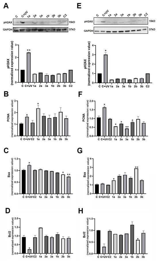 UVB radiation did not induce Bax expression but caused a significant reduction in Bcl-2 levels (Figure 2G,H). However, compound treatments induced Bax expression (Figure 2G) and, in general, maintained Bcl-2 at the control level (Figure 2H). Notably, compound 2b strongly induced Bax and contemporarily reduced Bcl-2.