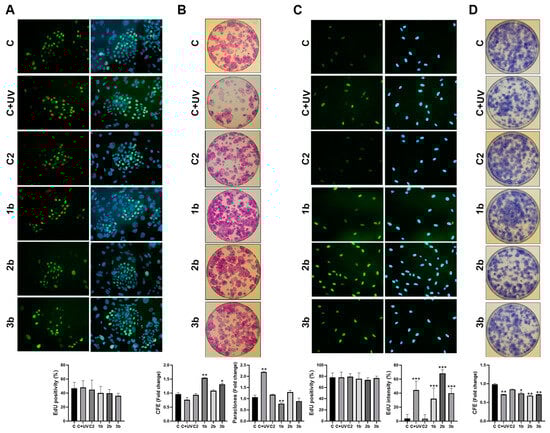 Thereafter, we treated cells only with compounds 1–3b, which were the most interesting based on previous experiments. It was reported that following UVB irradiation (100 mJ/cm2), the distribution of keratinocytes was substantially unaltered during cell-cycle phases, whereas fibroblasts were mainly found in the S-phase []. In keeping with these data, no significant differences were observed in the percentage of EdU-positive keratinocytes following treatments, although the administration of 1–3b slightly reduced this percentage (Figure 3A). The clonogenic ability of each treated culture was consistent with Bax and Bcl-2 expression. As expected, UVB irradiation decreased the percentage of keratinocyte CFE and increased the percentage of paraclones (Figure 3B). Conversely, treatments with compounds 1b and 3b induced an increase in CFE and a reduction in paraclones (Figure 3B).
