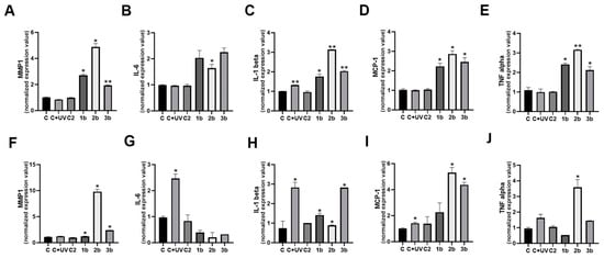 In our experiments, the UVB radiation stimulated IL-1 beta expression but did not induce MMP1 or expression of other cytokines in primary keratinocytes. In contrast, BTDs and TDPs induced the expression of mediators of matrix remodeling (Figure 4A) and inflammation (Figure 4B–E). Compounds 1–3b induced a significant increase in MMP1 and also primary fibroblasts (Figure 4F). Although UVB was able to stimulate cytokine expression in fibroblasts, the effect of BTDs and TDPs on inflammation was less evident compared to keratinocytes (Figure 4G–J). Notably, compound 2b promoted MMP1 and cytokine transcription in both cell types.