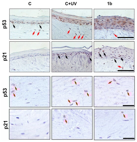 Some fibroblasts in the dermal compartment expressed p53 (red arrows) of control skin equivalents. Similar to keratinocytes, p21waf1 expression was not observed in fibroblasts. Following UVB exposure, p53 was expressed in most fibroblasts near the epidermal compartment and p21waf1 in a few cells (red arrows). The treatment with compound 1b induced both proteins in a few cells (red arrows).