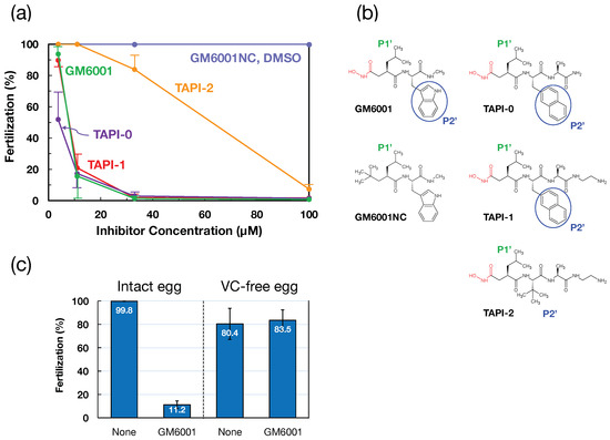 Figure 1. Effects of metalloprotease inhibitors on H. roretzi fertilization. (a) Metalloprotease inhibitors (TAPI-0 (purple), TAPI-1 (red), GM6001 (green), and TAPI-2 (orange)) were dissolved in DMSO at a concentration of 10 mM and were serially diluted 3-fold with ASW. The final inhibitor concentrations are indicated on the abscissa. GM6001NC (negative control; blue) is an analog of GM6001 without a metal-chelating hydroxamate group. The final concentration of DMSO (blue) used as a vehicle was 1% at 100 μM. Error bar: SE (n = 5). (b) The structures of the compounds used in (a) are illustrated. Every compound has a Leu residue at the P1′ position (green), whereas only strong inhibitors such as GM6001, TAPI-0, and TAPI-1 possess an aromatic ring at the P2′ position (blue circle). Notably, MG6001NC, lacking a hydroxamate group, has no inhibitory activity, even with the presence of an aromatic ring at the P2′ position (not indicated by a blue circle). For the nomenclature of the P1′ and P2′ positions, see [37,38]. (c) Effects of GM6001 on the fertilization of intact and VC-free eggs of H. roretzi. None, 0.1% DMSO; GM6001, 25 μM GM6001 containing 0.1% DMSO. Error bar: SE (n = 3).