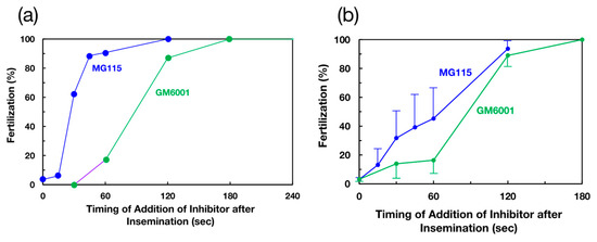 This potent inhibitory effect of GM6001 did not affect the fertilization of VC-free eggs (Figure 1c), suggesting that a metalloprotease is responsible for sperm penetration through the VC. To investigate the timing of the participation of a metalloprotease during fertilization, the effect of the addition of GM6001 after insemination on fertilization was examined and compared with the effect of the addition of MG115 (a proteasome inhibitor). One representative result and the combined results of five experiments are depicted in Figure 2a,b, respectively. GM6001 strongly inhibited fertilization even 1 min after insemination. The inhibitory ability was greatly reduced 2 min after insemination. In contrast, the inhibitory potency of the proteasome inhibitor MG115 diminished 30 s after the addition of sperm. Although both timings appear to be similar in Figure 2b, the timings of both inhibitors were always distinctly different (see Figure 2a). These results support our previous assumption that the sperm proteasome functions at the early stage of fertilization [21,35]. Although our present results cannot exclude the possible involvement of the metalloprotease in the binding of sperm to the VC, the metalloprotease obviously functions at the middle or late stage during the sperm passage of the VC. Compared with acrosin [20,35], which functions between 2 and 5 min after insemination, the metalloprotease appears to participate in fertilization at an earlier timepoint than does acrosin.