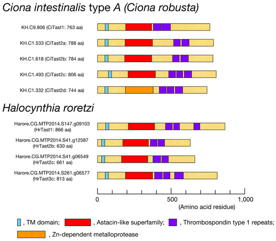 Figure 3. Schematic drawings of four H. roretzi Tast (astacin-like metalloprotease with thrombospondin type 1 repeats) proteins and domains, as predicted from the respective gene models. The domain organization, including the transmembrane domain, of Ciona intestinalis type A Tast proteins (CiTast1, CiTast2a, CiTast2b, CiTast2c, and CiTast2d) is also illustrated in the upper panel.