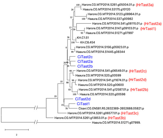 The nucleotide sequences of the PCR products were determined (see Figure S2). The numbers of nucleotides are 275 bp (HrTast1), 287 bp (HrTast2b), 200 bp (HrTast2c), and 334 bp (HrTast3c). The accession numbers of the sequences of the PCR products of HrTast1, HrTast2b, HrTast2c, and HrTast3c are LC849074, LC849104, LC849102, and LC849103, respectively.