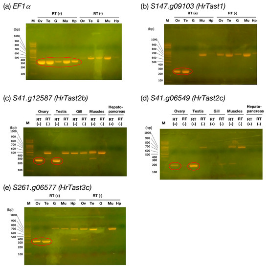 Figure 6. mRNA expression of HrTast genes. The ovary, testis, gill tissue, muscle tissue, and hepatopancreas were dissected from each sexually mature H. roretzi during the spawning season, from which RNAs were isolated and subjected to RT-PCR using the respective primers indicated in Table 1. The PCR products were subjected to agarose gel electrophoresis and visualized via UV irradiation of gels stained with ethidium bromide. The PCR products from cDNA are denoted with red circles. The EF1a gene was used as an internal standard and is expressed in every tissue or organ. M, marker; Ov, ovary: Te, testis: G, gill; Mu, muscle; Hp, hepatopancreas.