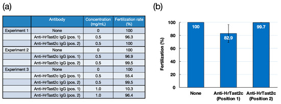 To investigate the role of HrTast in fertilization, two peptides corresponding to HrTast2c position 1 (Zn-binding site) and position 2 (unique sequence in HrTast2c with high antigenicity) were synthesized, and peptide antibodies were obtained as described in the Materials and Methods. Both antibodies showed high reactivities to antigenic peptides on the basis of ELISA (Figure S3). However, in the Western blotting of the sperm extract, the position 1 antibody produced no appreciable band, whereas the position 2 antibody produced several specific bands with molecular masses in the range of 50–100 kDa, which were blocked by the antigenic peptide (see Figure S3). Both antibodies were not useful for immunocytochemistry. Interestingly, the position 1 antibody, but not the position 2 antibody, weakly inhibited fertilization at a concentration of 0.5 mg/mL (Figure 7). The inhibitory ability appears to be variable among individuals. However, since the position 2 antibody (IgG) did not inhibit fertilization in different batches, the inhibitory effects on the fertilization of the position 1 antibody (IgG), which reacts to the Zn-binding consensus sequence, suggest the possible participation of HrTast2c in fertilization. Further studies are necessary to investigate the localization and roles of four HrTast metalloproteases, HrTast1, HrTast2b, HrTast2c, and HrTast3c, in fertilization.