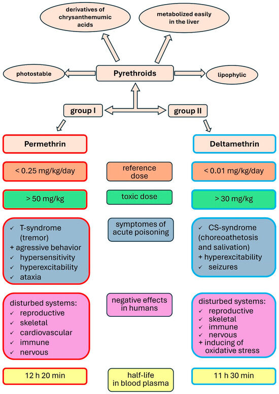 Pyrethroids have been divided into two groups based on the mechanisms of their toxic actions [11,16,17]. Permethrin belongs to group I pyrethroids. Permethrin poisoning in humans causes parasthesia, skin irritation and itching, throat and abdominal pain, nausea and vomiting, headaches, mucous membrane irritation, breathing problems, and dizziness [11,16,17]. Deltamethrin is classified as a pyrethroid of group II. Deltamethrin poisoning causes vomiting and diarrhea, muscle tremors, heart rhythm disturbances with tachycardia, cough, runny nose, pulmonary edema, blurred vision, somnolence, and convulsions [11,16,17]. When in contact with the skin, deltamethrin may cause an allergic reaction characterized by rash, itching, burning, redness, and irritation of the mucous membranes [1,6,18]. The characteristics of permethrin and deltamethrin are presented in Figure 1.
