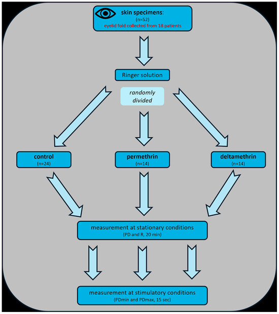 Human skin specimens (n = 52) were collected from the eyelid folds of patients of the Department of Plastic, Reconstructive, and Aesthetic Surgery of the University Hospital No. 1., Dr. A. Jurasz, in Bydgoszcz, Poland, with the consent of the Bioethics Committee of the Nicolaus Copernicus University in Toruń, functioning at Collegium Medicum in Bydgoszcz, Poland (no. KB 218/2015, of 12 March 2015). The patients, aged 50–65 years, including 12 women and 6 men, were operated on under aseptic conditions, observing the principles of art, due to non-inflammatory eyelid disorders (a diagnosis code of 9A06.Y according to the 11th version of the International Statistical Classification of Diseases and Related Health Problems [33] or H02 according to 10th version of the International Statistical Classification of Diseases and Related Health Problems [34]). They were assessed by the attending physician as being in good health, did not suffer from any chronic or acute diseases, and did not confirm any previous contact with pesticides. The characteristics of the patients are presented in Table 1. A specimen of the skin from each eyelid was collected from every patient. The prepared skin specimens were alive, with preserved layering and nerve endings, and did not contain muscle or adipose tissue.